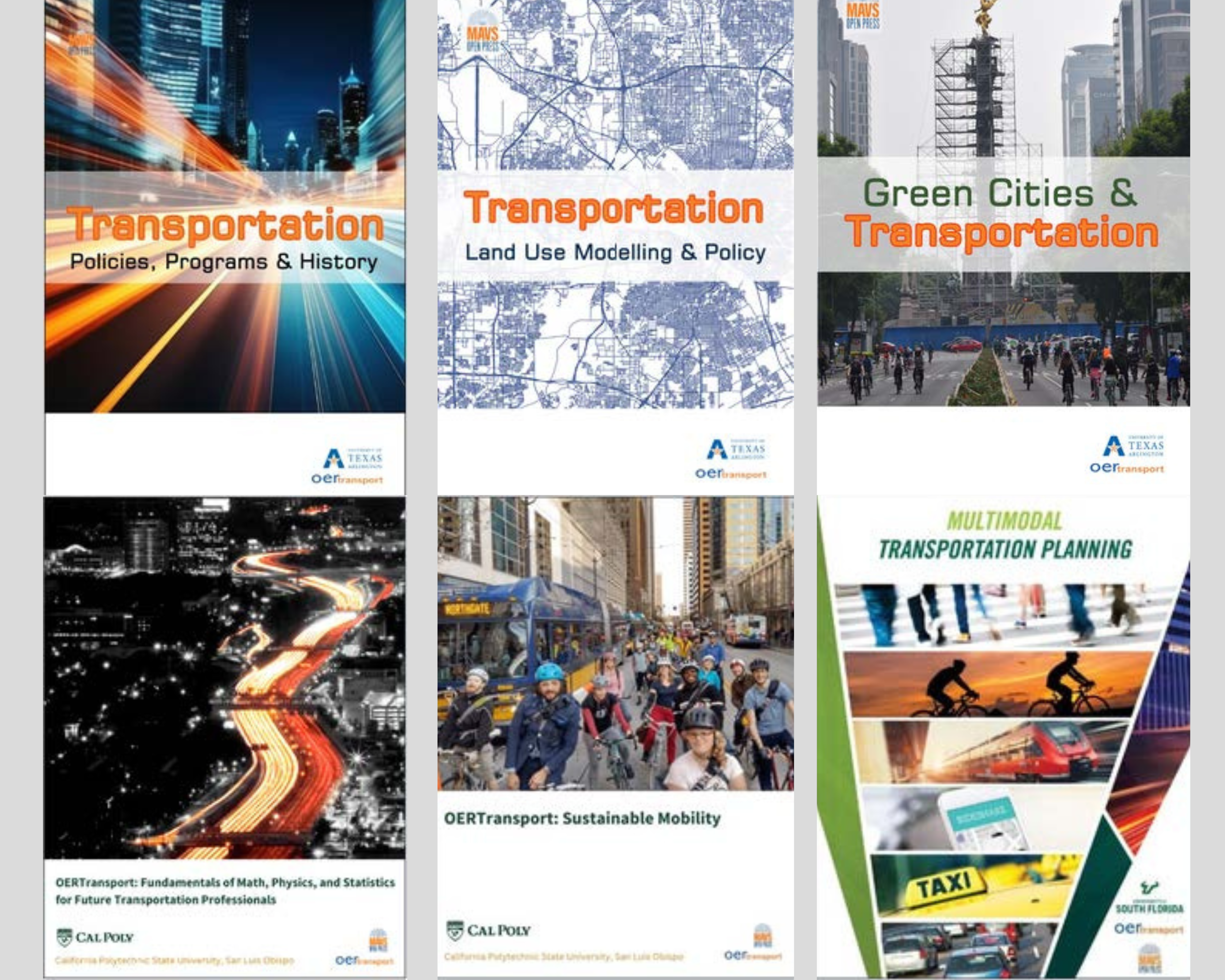 The textbooks span core topics in transportation planning, including land use modeling, multimodal systems, sustainability, and mathematical and physical foundations needed for transportation engineering. Each was developed in collaboration with faculty, graduate research assistants, an industry advisory group, and piloted in classrooms at UTA, Cal Poly San Luis Obispo, and the University of South Florida. The six titles include: