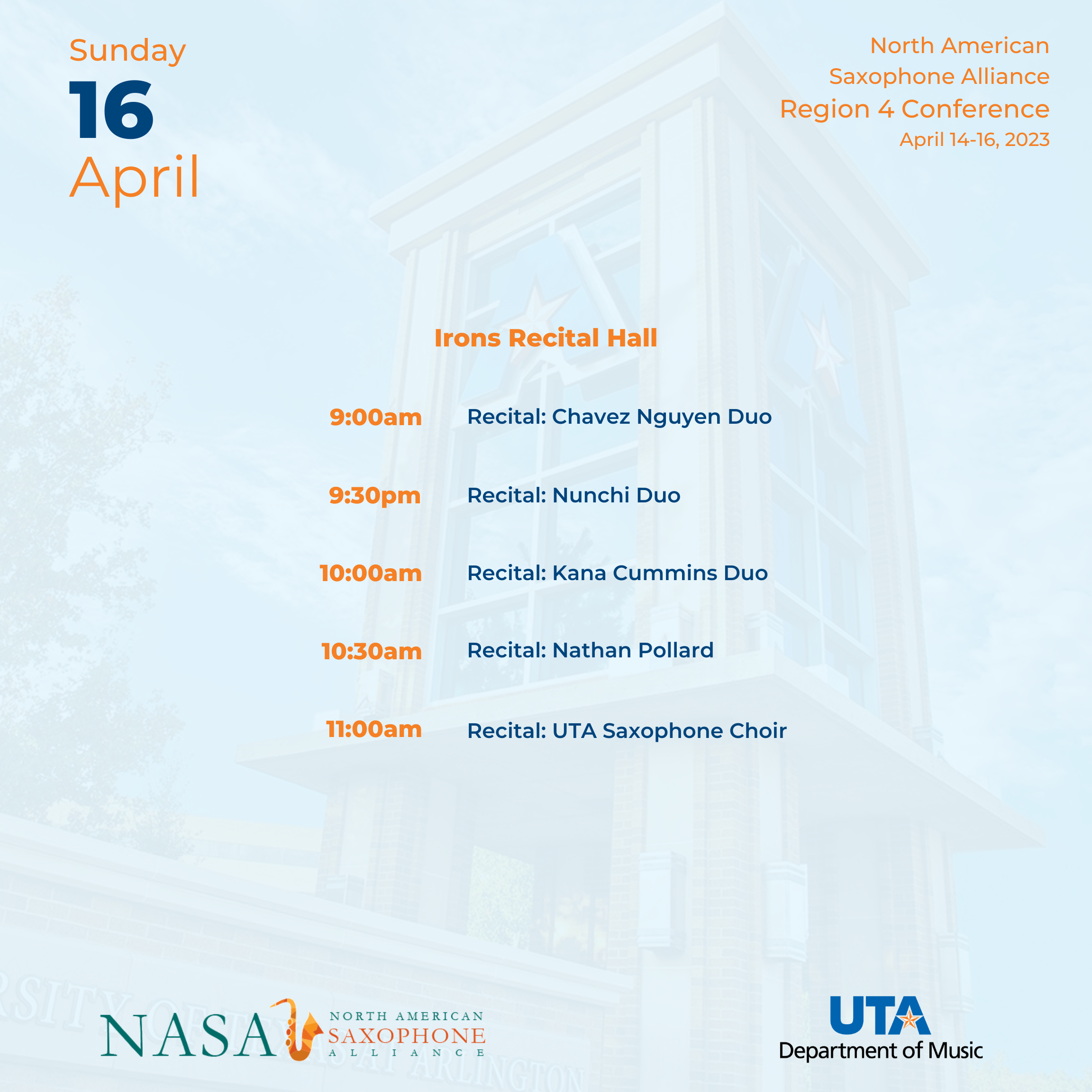 THE UNIVERSITY OF TEXAS AT ARLINGTON DEPARTMENT OF MUSIC IS LOOKING FORWARD TO HOSTING THE NORTH AMERICAN SAXOPHONE ALLIANCE REGION 4 CONFERENCE APRIL 14-16, 2023.