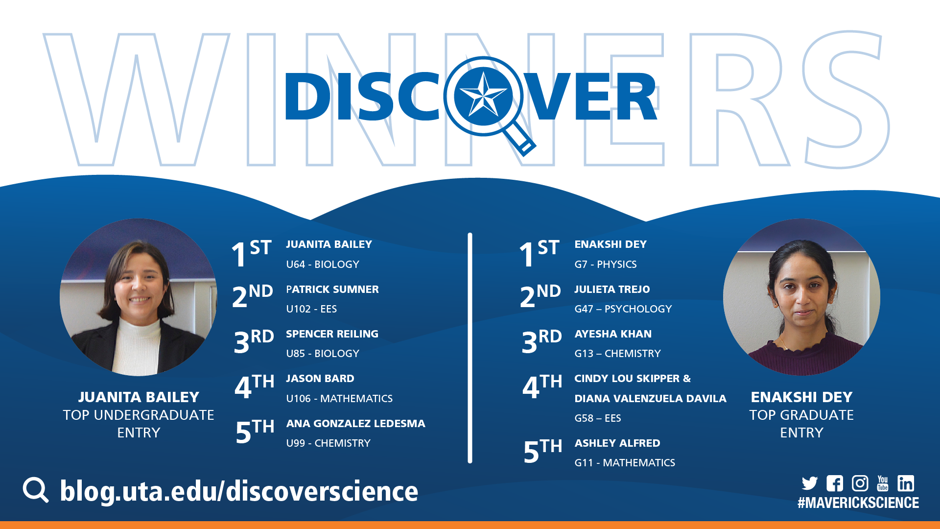 A panel of UTA faculty, alumni and area industry professionals served as judges. They conducted online reviews of all the entries and from these rankings, five undergraduate and five graduate finalists were named. On April 21, all of the participants displayed their posters for the public in the Chemistry and Physics Building and the Chemistry Research Building.