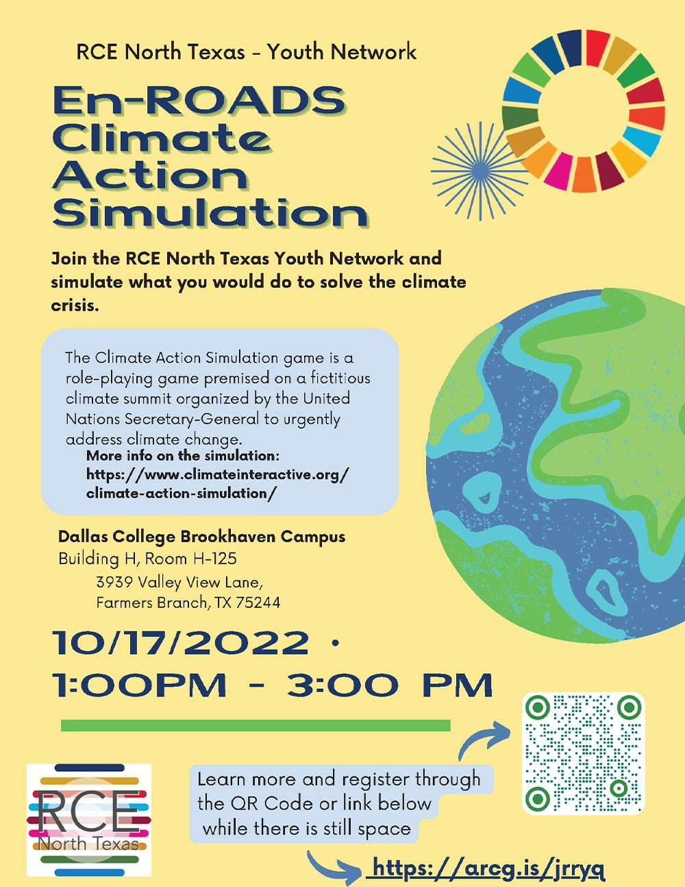 Join the RCE North Texas Youth Network for a Climate Action Simulation game to gain an immersive point of view on how to work on climate action solutions. The game is conducted as a simulated emergency climate summit organized by the United Nations to establish a concrete plan to limit global warming by bringing together government, business, and civil society representatives.