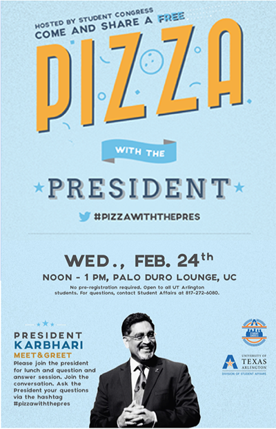 Tuesday, Feb. 23Afternoon Showcase Free. Noon-2 p.m., Palo Duro Lounge, E.H. Hereford University Center. EXCEL Campus Activities. Wednesday, Feb. 24Pizza with the President Join President Vistasp Karbhari for lunch, remarks, and a question-and-answer session. Free. Noon-1 p.m., Palo Duro Lounge, E.H. Hereford University Center. Office of the President. Friday, Feb. 26Men's Tennis Mavericks vs. Incarnate Word. Free. 2 p.m., UTA Tennis Center. Athletics. Opera Performance of Johann Strauss' 'Die Fledermaus' A joint production of the music and theatre arts departments. Tickets $12 general public, $9 students, seniors, faculty, staff. 8 p.m., Irons Recital Hall, Fine Arts Building. Also, 2:30 p.m. Sunday, Feb. 28. Music. Saturday, Feb. 27Dr. Seuss Birthday Party Celebrate beloved children's author Dr. Seuss and the joy of reading. Children can enjoy stories read by UTA students, Dr. Seuss-themed arts and crafts, face painting, puppet shows, and picture opportunities. Free. 11 a.m.-1 p.m., Palo Duro Lounge, E.H. Hereford University Center. Freshmen Leaders On Campus, Leadership Center.