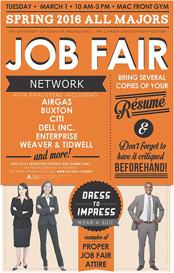 Put your best foot forward at All-Majors Job FairBe ready for your future when you attend the All-Majors Job Fair for UTA students and graduates only. The fair is from 10 a.m.-3 p.m., Tuesday, March 1, at the Maverick Activities Center. No registration is required for the free fair. Wear a suit and bring your student ID and plenty of résumés. Companies will be on hand to talk with students, take résumés, and discuss job possibilities. See a list of companies attending the Job Fair. See the workshops schedule, which also includes programs after the fair and during the semester. The Career Development Center also sponsors interview sessions with companies. For more information on the Job Fair and job hunting, contact the Career Development Center at careers@uta.edu or 817-272-2932. Professional head shots available at job fairSign up to have a professional photograph taken for your LinkedIn account during the All-Majors Job Fair on Tuesday, March 1, at the Maverick Activities Center. Time slots are available 9:30 a.m.-3 p.m. Professional dress is required. Register online by 5 p.m. Thursday, Feb. 25, or when there are no longer time slots available. Professional photographers will take your head shot in a pop-up studio. You will receive an email with a link and password to download your photos. Read how to put together a professional LinkedIn profile. Volunteers needed for Job FairThe Career Development Center needs more than 125 volunteers to help make the All-Majors Job Fair a success. The Job Fair is from 10 a.m.-3 p.m. Tuesday, March 1, at the Maverick Activities Center. Register by 5 p.m., Wednesday, Feb. 24. Choose a 1.5-hour shift or indicate your availability between 7 a.m. and 4 p.m. Tasks include set-up, clean-up, carrying employer materials, escorting employers to their booths, and staffing the student check-in tables. For questions, call 817-272-2932 or email Alissa Anderson at alissa.anderson@uta.edu.