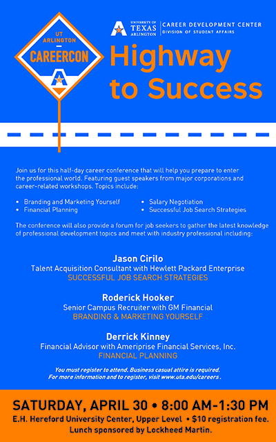 University College hosts job fair for summer, fall on-campus gigsUniversity departments, offices, and programs are looking for student workers for summer and fall. Check out these jobs and learn more at the Career Development Center. University College will host its job fair 4-6 p.m. Tuesday, April 19, in the lobby of Ransom Hall. Hiring departments will be on hand with job descriptions, and SNAP Job representatives will be present to assist students with questions and job searches. University Tutorial and Supplemental Instruction (UTSI) is looking for motivated students to become tutors and SI leaders for the fall semester. Tutors and SI leaders are personable students who earn As and Bs in their courses and want to share their knowledge with their fellow Mavericks. For details, visit uta.edu/tutoringjobs. Join the summer conferences team and assist more than 8,000 guests who will come to campus. Both live-in and hourly positions are available. Apply on Snap Jobs for conference assistant (#8934) and office assistant positions (#8935). A supplemental application is required and is available at uta.edu/conferences. Money Smart Week workshops, credit counseling availableThe Department of Finance at the College of Business will host a series of financial literacy workshops and free credit counseling during Money Smart Week, Monday-Thursday, April 25-28. Receive personal financial advice and credit consultations from financial services professionals 9 a.m.-3 p.m. at different locations on campus. Professional loan officers will be available to offer personal credit report evaluations and recommendations for improvement. Attendees will obtain a free copy of their credit report and consultation. Read more about the Money Smart Week workshop schedule.