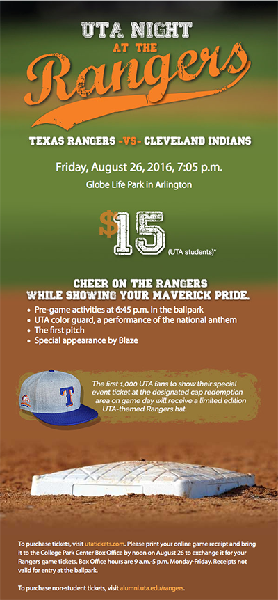 Join fellow Mavericks at the ballpark for UTA Night with the Texas RangersPut on your Maverick blue for a night of fun when the Texas Rangers take on the Cleveland Indians for UTA Night with the Rangers on Friday, Aug. 26. Game time is 7:05 p.m. Tickets are $15 at utatickets.com for seats in sections 204-209 of Globe Life Park. You must bring your receipt to the College Park Center Box Office and exchange it for an actual ticket by noon, Friday, Aug. 26. The box office is open 9 a.m.-5 p.m. Mondays-Fridays. For groups purchasing tickets separately but who want to sit together, have group members pick up tickets together at the box office. There will be no exchanges once tickets have been issued. If you need any assistance purchasing your tickets, contact the UTA Box Office at 817-272-9595 or boxoffice@uta.edu. Register your vehicle; Park and Ride a new optionParking permits are available now for students for the 2016-17 year. Park and Ride—only $80—allows students to park at Maverick Stadium (Lot 25) or the intramural fields complex (Lot 26) and ride a shuttle bus to class. The buses takes students to the Business Building in about 12-15 minutes and the Smart Hospital in 20 minutes Other parking options include permits for the academic year, one semester, monthly, and weekly, and the Maverick Parking Garage. Read more about parking options. To purchase a parking permit, visit uta.edu/pats and click on Obtain a Permit under the big blue P. UTA Choirs recruiting for fallLike to sing? Audition for UTA Choirs Wednesday-Friday, Aug. 24-26. UTA has three choirs, and you do not have to be a music major to participate. Singers with previous choral experience or music reading ability are encouraged to audition. The choirs require course enrollment for one hour elective credit. For details and to schedule an audition, visit the choirs' website.
