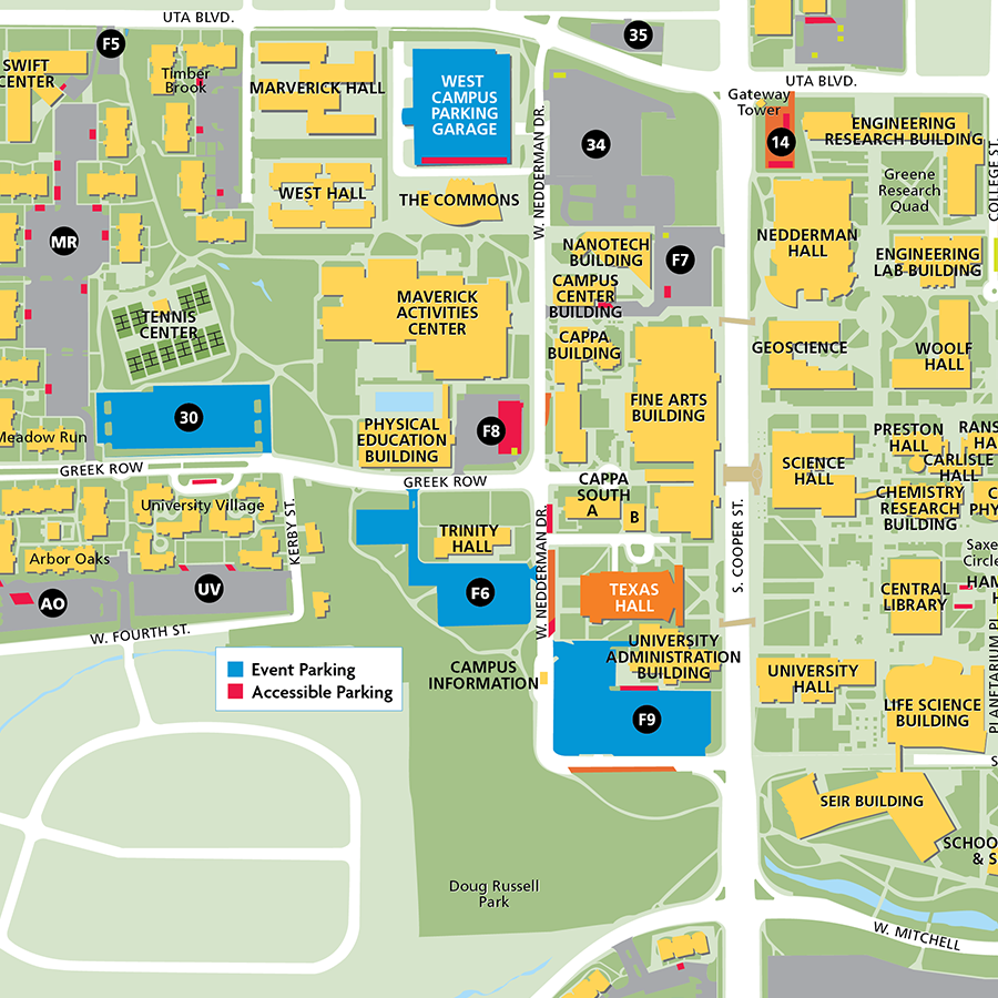 Visitor parking for Texas Hall events will be available in lots F9, F6, 30, and the West Campus Parking Garage.