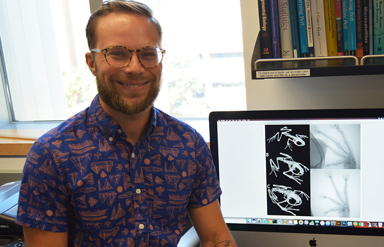 Kyle O'Connell is using CT scans of parachuting frogs in his doctoral research.