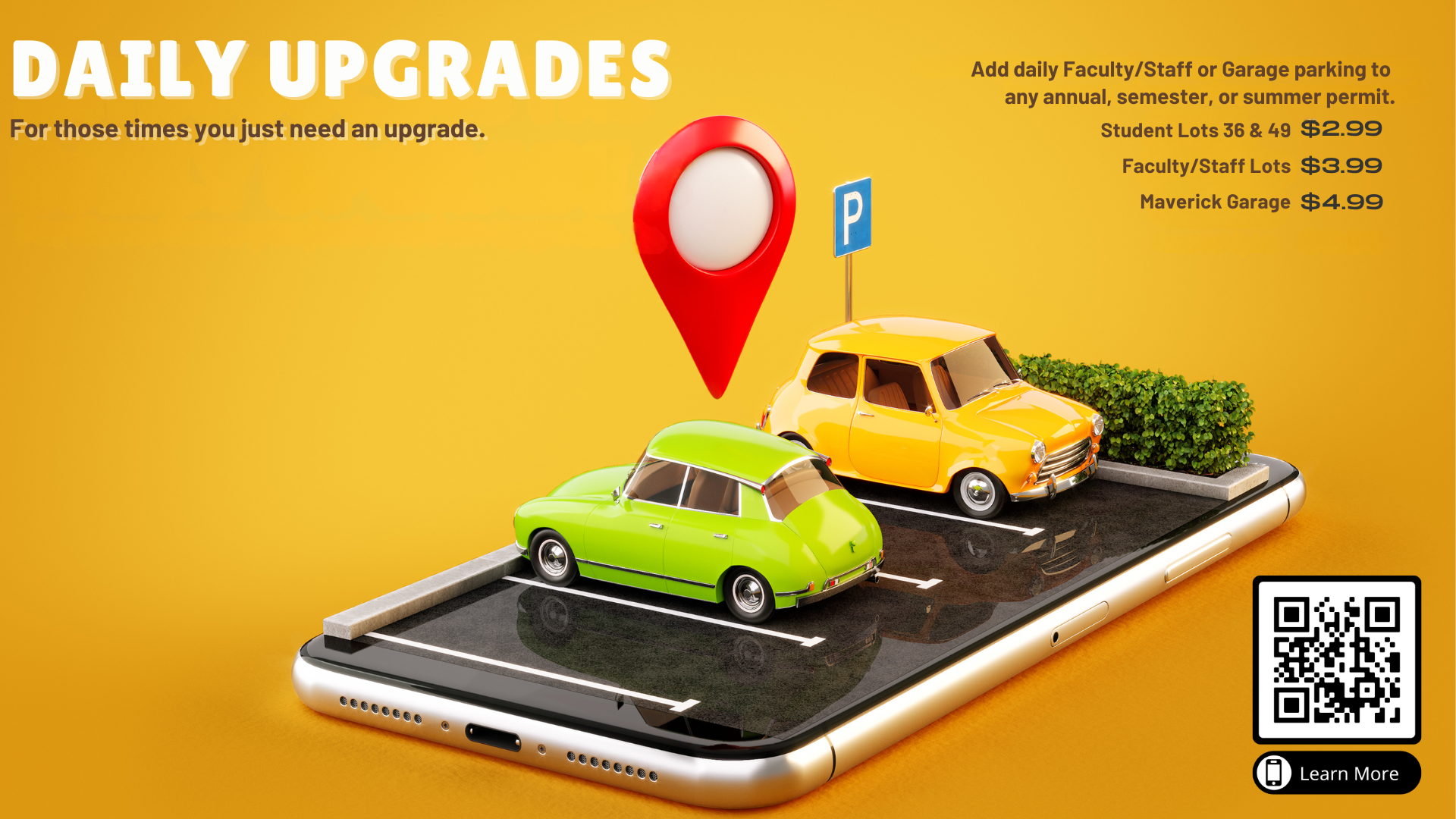 Availability is limited each day and the permit must be pre-purchased in the MavPark portal. Login to Mavpark, then click Purchase Permits >> then Daily Upgrade Permits. Select the date(s) you want to upgrade your parking, then pick from the available locations to complete your transaction. Locations will only be displayed if they have available Upgrade Permits available.