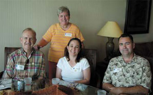 | From left: Bob Van Siclen, Mary Ann Van Siclen ('85), Michelle Donahue ('99) and Mark Donahue enjoy a night of horse racing hosted by the Alumni Association at Lone Star Park in Grand Prairie. |