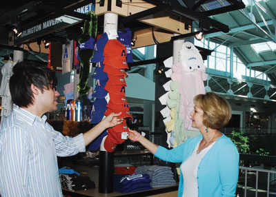 the UT Arlington Maverick Market. The kiosk selling University merchandise