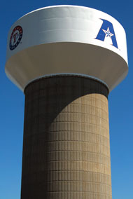 A water tower along Collins Street in Arlington bears the