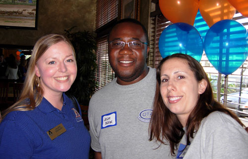 Valerie Cavanagh, Jason Baker (’01, ’03) and Melisa Baker (‘00) at the Houston Alumni Chapter mixer at Champps Uptown.