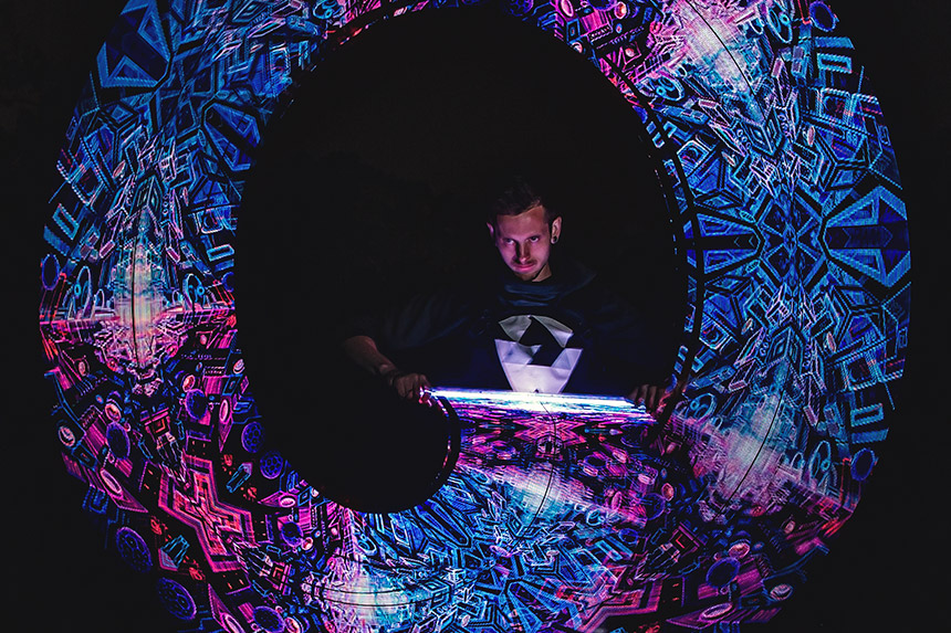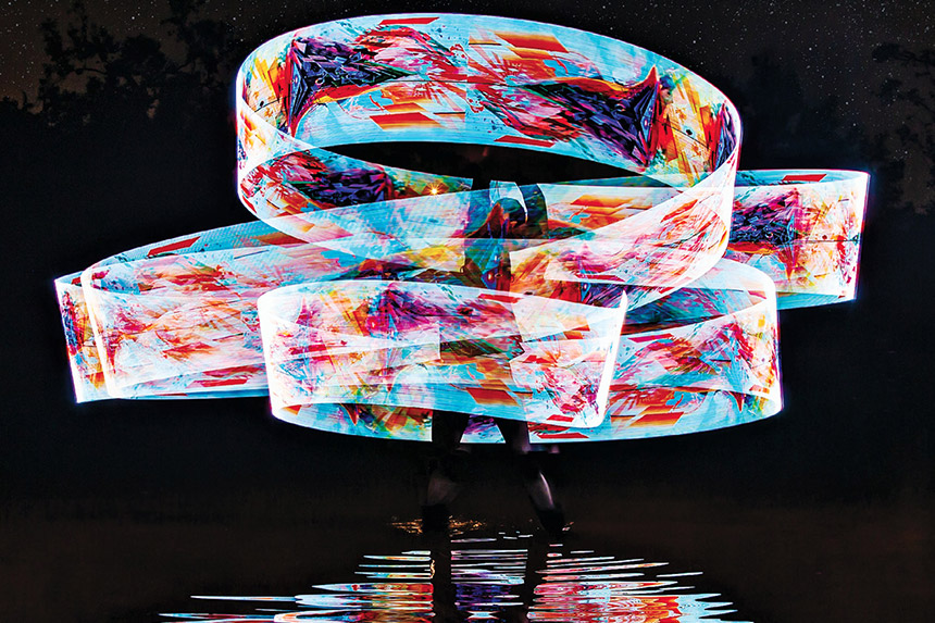 Dalton sessumes (’16 BS, ’18 MS, Physics) walks between worlds, balancing a keen intellectual interest in the inner workings of things, from small machines to the vastness of the universe, with a kind of performance art that allows him to create stunning displays of light and movement for an audience.