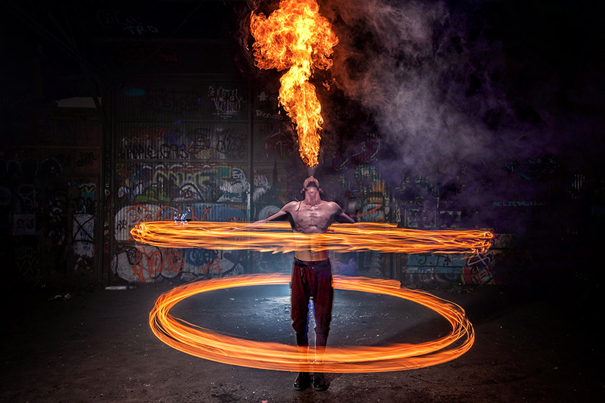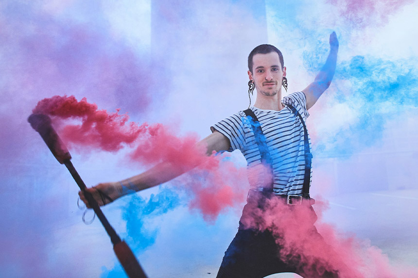 As a performer, Sessumes has traveled the world with Cirque du Soleil. He’s also made a name for himself as an innovator in the flow arts community, exploring the various implications of light as a medium, from LED props to holographic light projection. And in 2017, he founded a company, MindWorks, to provide performance entertainment, like circus or character work, for companies and events.