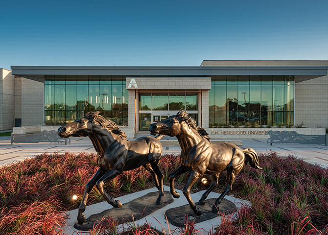 Of course, the new entrance wouldn’t be complete without statues of horses, a tribute to UTA’s mascot. Horses also adorn either side of the front doors.