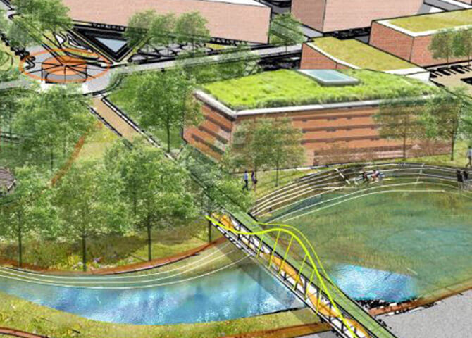 The winning team redesigned the University’s master plan to incorporate green infrastructure practices at key locations, including transportation corridors and local water bodies. The team included Master of Landscape Architecture (MLA) students Michael Shuey (lead), Nusrat Jahan Nipu, and Reza Mabadi. The fourth team member, Kathleen Stanford, is a Master of Urban Planning student.
