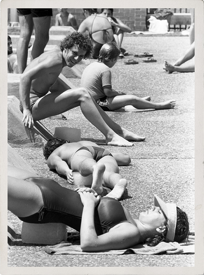 Students attempt to melt 10-pound blocks of ice during the Non-Invitational Belly Flop and George Hamilton Tan Competition, held on campus in June 1980. Anything to beat the summer heat!